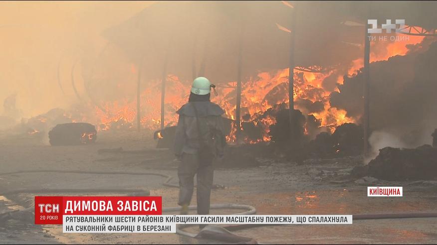 Понад 6 годин гасили пожежу на суконній фабриці під Києвом. Спочатку зайнялося у цеху, згодом - горіли склади. Вогонь охопив площу у півтори тисячі квадратних метрів. Приборкати його намагалися рятувальники із шести районів області.