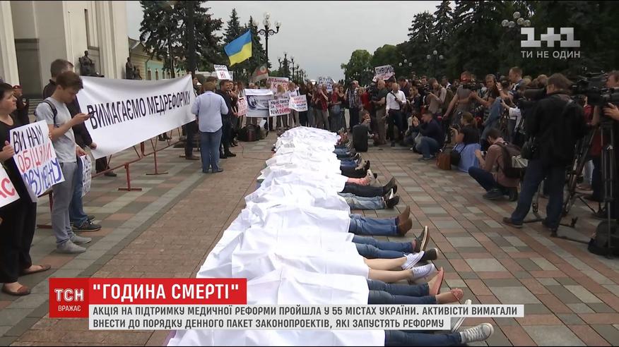 Активісти лягали на землю і накривалися простирадлами, аби нагадати владі - щогодини 67 людей помирають, не дочекавшись медичної допомоги. Зробити революцію у вітчизняній системі охорони здоров’я покликані законопроекти, що мають змінити фінансування усіх лікарень. Під тиском депутати внесли їх до порядку денного.