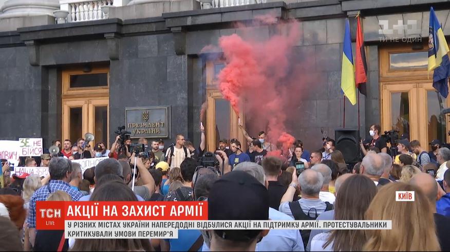 У Дніпрі близько сотні активістів, волонтерів та ветеранів війни на сході критикували умови перемир'я, бо впевнені: нічого доброго воно не принесе - ворог вогню не припиняє, а заборона на використання розвідувальних підрозділів та снайперів нашкодить українським воїнам. У Харкові на акцію "захисти захисників" зібралося кілька сотень людей. Основа вимога мітингувальників - не здавати інтереси країни та відкликати домовленості, які російська сторона все одно порушує. У Києві протестувальники зібралися під офісом президента, обурювалися телефонною розмовою Зеленського і Путіна.