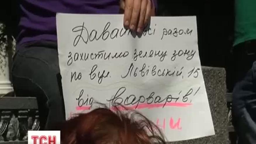 Десяток киян із плакатами вишикувалися біля входу у відомство, а згодом - залізли на паркан. КПП перегородили гіллям. У такий спосіб мітингувальники хочуть привернути увагу до незаконного вирубування лісу.