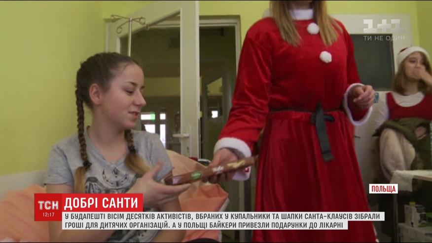 Вісім десятків активістів у самих лише купальниках пробіглися Будапештом. Гроші, зібрані під час дійства, передали дитячим благодійним організаціям. А от у Польщі в костюми Санта-Клаусів вбралися байкери. Сотня чоловіків та жінок завітала до дитячої лікарні у Любліні, аби розрадити юних пацієнтів і вручити їм подарунки.