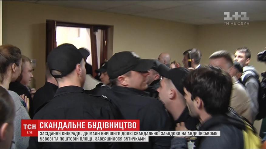 Штовханиною та поламаними дверима завершилося напередодні засідання Київради. Активістам набридло цілий день чекати, коли розглянуть питання про скандальні забудови на Андріївському узвозі та Поштовій площі, і вони заблокували депутатів у сесійній залі. З огляду на сутички, сесію вирішили закрити, а розгляд дражливих питань перенесли на наступне засідання.