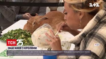 Американка перемогла одразу двох кролів на конкурсі з поїдання салату. Влаштував змагання каліфорнійський магазин, який продає здорову їжу. Спершу 27-річній дівчині запропонували позмагатися з гігантським кролем на прізвисько Хані Банні - хто швидше впорається з порцією зелені. Американка настільки вправно жувала салат, що організатори згодом дозволили власнику її конкурента привести на допомогу ще одного кроля. Втім, навіть разом гризуни не змогли перемогти людину.