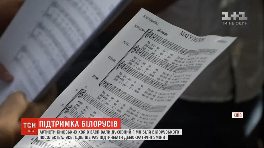 Артисти з київських хорів прийшли до білоруського посольства в Києві, щоб підтримати демократичні зміни у судній країні. Заспівали духовні гімни Білорусі "Могутни Божа" та України "Боже великий єдиний". Попри те, що активісти про акцію не заявляли і не просили дозволів, під установою ніхто не був проти, і співаків навіть не питали, навіщо вони зібралися.