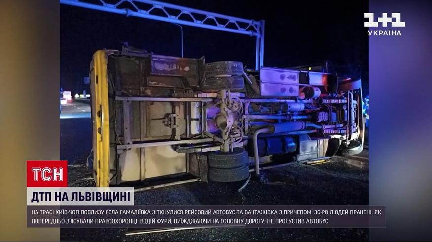 36 чоловік дістали поранення, серед них троє дітей. Це наслідки аварії, яка сталась на Львівщині. На трасі Київ-Чоп поблизу села Гамаліївка зіткнулися рейсовий автобус та вантажівка з причепом. Як попередньо з'ясували правоохоронці, водій вантажівки, виїжджаючи на головну дорогу, не пропустив автобус. Від удару, бус, повний пасажирів, перекинувся на бік. Потерпілі отримали травми різного ступеня складності.