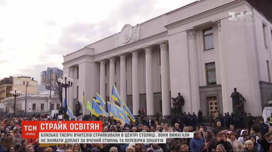 Вимагали не ухвалювати змін до закону про середню освіту, які ініціювали депутати від фракції "Голос". А саме - зняття надбавок і доплат педагогам, за вислугу років, навчальний ступінь, перевірку зошитів і навіть керування класами. До страйкарів вийшли депутати під вигуки "Ганьба", пообіцяли не вносити цих змін до закону про середню освіту.