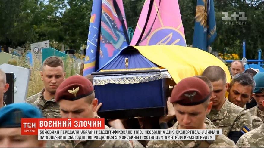 Неідентифіковане тіло донецькі окупанти передали на підконтрольну територію України. Це сталось після нелегких перемов. Утім, підтверджень того, що це саме військовий медик, Микола Ільїн, який загинув 13 липня поблизу села Зайцеве, наразі немає. Найближчим часом мають провести ДНК-експертизу. Невідома і доля пораненого, який залишився на полі бою. Вже третій день поспіль російські загарбники не дають українській стороні проводити пошук нашого військового. Ще 13 липня, український розвідник Дмитро Красногрудь підірвався на міні у сірій зоні. Аби його врятувати, на лінію вогню, отримавши згоду окупантів, вийшла евакуаційна група. Однак, ворог порушив домовленість і влаштував обстріл. Військовий медик загинув на місці, його провідник пораненим залишився на полі бою. Тіло морського піхотинця, лейтенанта Дмитра Красногрудя бойовики віддали напередодні. Нині офіцера-розвідника провели в останню путь - у Лимані Донецької області.