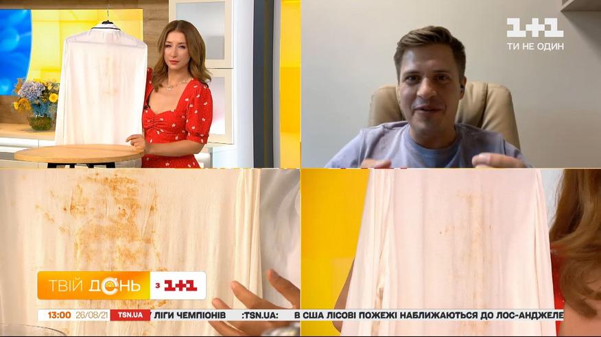 І як і обіцяли - показуємо результати нашого брудного експеримента. Вчора ми разом з нашим експертом, біохіміком Глібом Репічем виводили іржу з білої блузи. Гліб знайшов спосіб впоратися з цією проблемною плямою. Він занурив одяг в окроп, куди додав лимонну кислоту. І зараз Гліб Репіч приєднується до нас. Будемо перевіряти результат разом з ним.