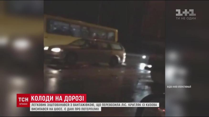 Із вантажівкою, що перевозила кругляк, зіштовхнувся легковик, тому увесь вміст кузова висипався на дорогу. Здоровезні колоди не лише перегородили шлях - є інформація про потерпілих.