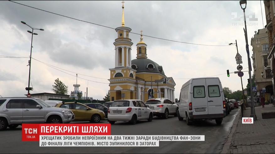 Жителі Києва з початком робочого тижня на повну відчули на собі наслідки ремонту доріг та підготовки міста до проведення фіналу футбольної Ліги чемпіонів. На Хрещатику розпочали зводити фан-зони - відтак головну вулицю столиці перекрили на найближчі два тижні.