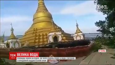Очевидці зняли на відео останні хвилини буддистського храму. Через повінь вода у річці піднялася і розмила фундамент споруди. Пагода почала поступово сповзати і за лічені хвилини потонула у воді. У країні зараз триває сезон дощів. Через повінь з небезпечних регіонів М`янми евакуювали майже 100 тисяч людей. З початку липня там загинули щонайменше 2 людини.