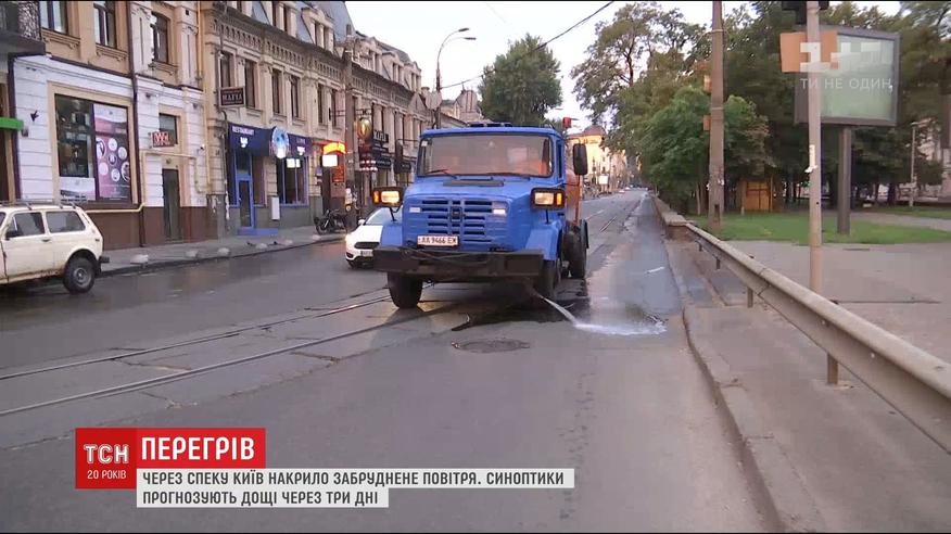 Це забруднене повітря, яке не підіймається угору, а тримається землі. Найбільше шкідливого там, де їздять машини, тому дороги у столиці рясно поливають. А у Львові чоловік помер просто на вулиці. Лікарі кажуть: у померлого 60-річного чоловіка були проблеми із серцем, і їх могла загострити спека.