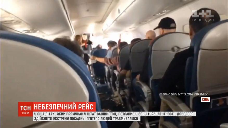 Літак, який прямував зі штату Каліфорнія у Вашингтон, трусило так, що травмувалися п'ятеро людей, з них - трьох шпиталізували. Під час турбулентності візок з напоями буквально підстрибнув в повітрі. У прохід між рядами повипадали бляшанки та коробки. Літаку довелося здійснити екстрену посадку у місті Ріно.