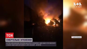 Аварія сталася вночі під містом Вознесенськ, що у Миколаївській області. Вантажівка виїхала на зустрічну смугу і врізалась у іншу фуру. Удар був такої сили, що автомобіль перекинувся. Обидві вантажівки запалали. Самовидці кажуть: звук зіткнення чули далеко навкруги. Один водій устиг вискочити з кабіни. Інший, разом із пасажиром, загинув на місці. Чому сталася смертельна аварія - дізнавалася ТСН.
