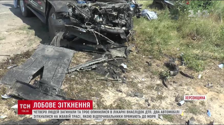 ДТП сталася на трасі, якою до моря їздять відпочивальники. Водій іномарки Пежо, імовірно, пішов на обгін, не впевнившись у безпечності свого маневру. І на зустрічній лобом у лоб зіткнувся з позашляховиком. Кермувальник легковика та троє його пасажирів від травм загинули. Ще двоє пасажирів цього ж авто - у тяжкому стані в лікарні.