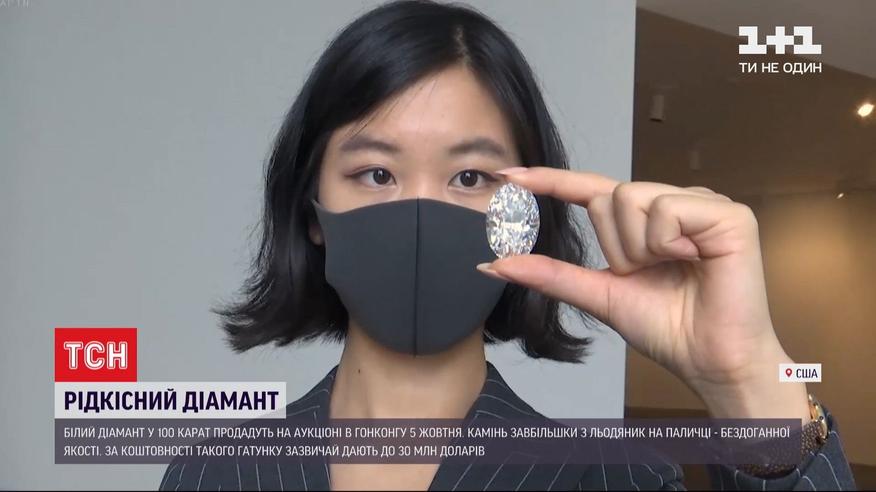 Білий діамант у сто карат, розміром з "Чупа-чупс", продадуть на аукціоні в Гонконзі. Камінь бездоганної якості та відмінної огранки. Такі трапляються надзвичайно рідко. Цей знайшли два роки тому на діамантовій шахті в Канаді. За коштовності такого ґатунку зазвичай дають до 30 мільйонів доларів. Торги призначені на п’яте жовтня.