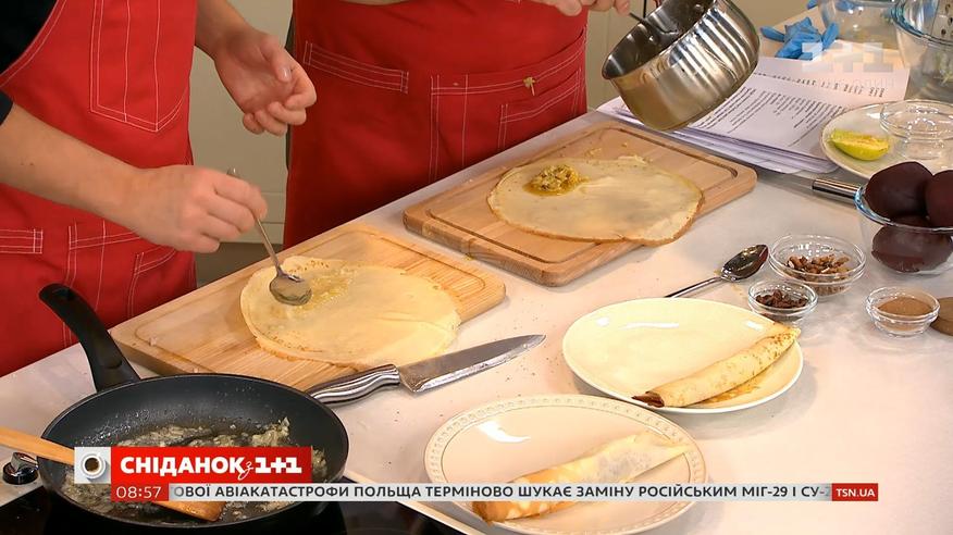 У нас в гостях кулінарний експерт Євген Клопотенко приготував три незвичайні начинки для млинців: цибулевий конфітюр, начинка з буряка з шоколадом та горіхами, а також начинка з яблук з корицею, медом, анісом та імбиром.