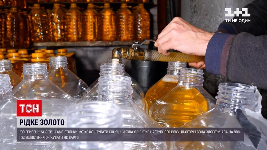 Сотня гривень за літр! Саме стільки може коштувати пляшка соняшникової олії на полицях крамниць уже наступного року. На тлі суттєвого підвищення цін на майже всі продукти харчування - вона заслужена рекордсменка. Бо додала в ціні цього року аж 80-т відсотків. Експерти радять уже подумати про запаси. А от хто винен у тому, що українці ще більше зароблених кревних мають витрачати на харчі, - вивчала ТСН.