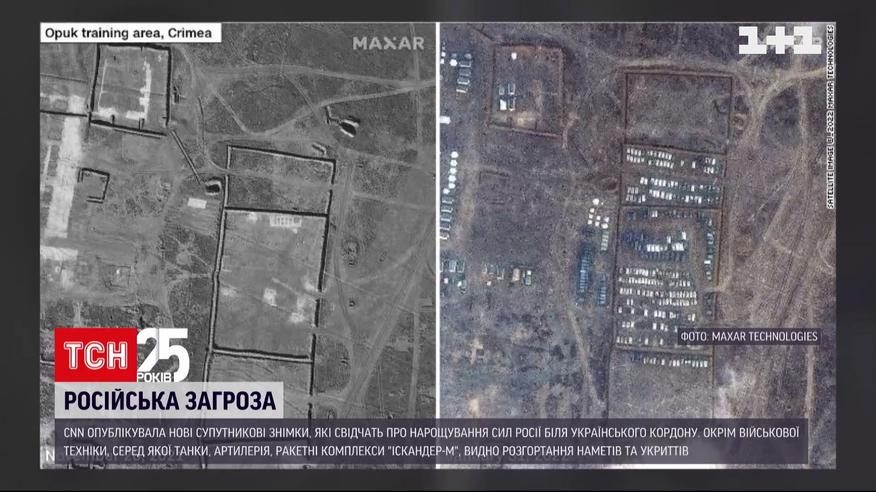 Нові супутникові знімки, які свідчать про продовження нарощування сил Росії біля українського кордону опублікувала CNN. Зробила знімки американська компанія "Максар Текнолоджіс". Там заявляють - розгортання російських військ нині на підвищеному рівні активності і готовності. На світлинах, окрім військової техніки, видно збільшення кількості наметів і укриттів.