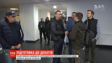 Робочі групи обох кандидатів знову не змогли остаточно вирішити, як відбуватимуться дебати. Сторона Зеленського запропонувала одну сцену для двох кандидатів і модератора. На трибунах 30% прихильників Зеленського і 30% - Порошенка. Решта людей – усі охочі. У Порошенка хочуть дві окремі сцени для двох кандидатів. На трибунах - половина прихильників чинного президента і половина від Зеленського. І ніякого вільного входу для інших охочих.