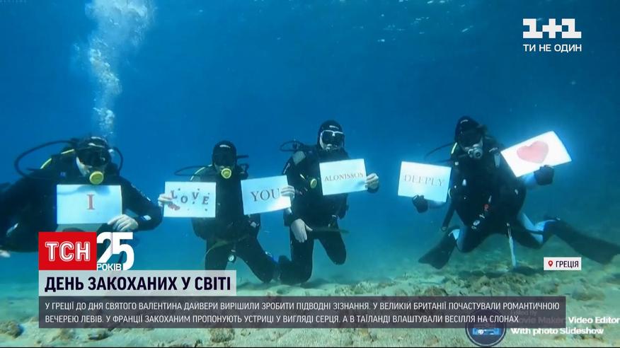 Підводні зізнання, устриці у формі серця і під вінець на слоні. У всьому світі сьогодні відзначають День святого Валентина. Із нагоди свята в Греції дайвери вирішили зануритися на морське дно, де дістали плакати із сердечками. А одна з пар навіть поцілувалася. У Великій Британії до дня закоханих улаштували романтичну вечерю для левів. Доглядачі Лондонського звіринцю сподіваються, що після такого побачення Ар'я та Бану подарують їм левенят. А на Півдні Франції - вирішили потішити парочки вишуканою стравою - устрицями у формі серця.