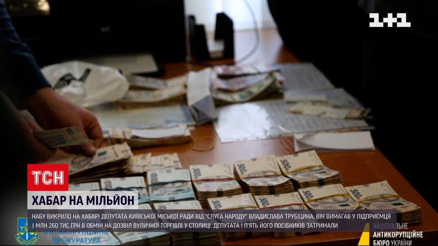 Мільйон 260 тисяч гривень: на такому хабарі викрили депутата Київради від "Слуги народу" Владислава Трубіцина. Відео оборудки надвечір опублікували на сайті НАБУ. За даними антикорупційних органів, разом з п'ятьма співучасниками Трубіцин вимагав хабар від підприємця в обмін на дозвіл вуличної торгівлі в столиці, зокрема, на встановлення МАФів у різних районах Києва. Депутата заскочили "на гарячому".