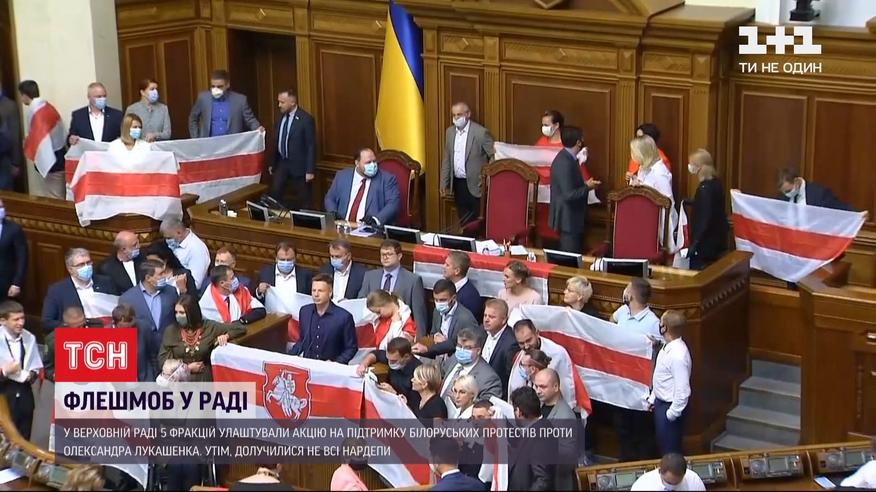 "Живє Білорусь!". Верховна Рада сьогодні у біло-червоно-білих прапорах - це історичний національний прапор Білорусі. Саме під цим стягом білоруський народ бореться з режимом Лукашенка. Народні депутати таким чином хотіли висловити свою підтримку протестувальникам. Знайшлися окремі особи, які виступили за збереження тоталітарного режиму у сусідів, у гостьовій ложі на скотч повісили старий радянській прапор, щоправда, догори дригом. Але виступи з трибуни, незалежно від фракційної приналежності, відбулися під національно-визвольними знаменами.