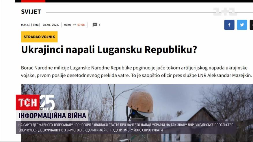 Державне ЗМІ Чорногорії фактично визнало ЛНР та написало про напад з боку України. Новина з заголовком "Українці напали на Луганську республіку?" - із знаком питання – з'явилося на сайті державної телекомпанії RTCG. В ньому, посилаючись на заяву пресслужби офіцера так званої ЛНР, журналісти пишуть про обстріл української армії. Українське посольство в Чорногорії вже звернулося до телекомпанії із закликом припинити в час загрози російського нападу на Україну поширювати інформацію, що не збігається з офіційною позицією Чорногорії щодо територіальної цілісності України та дотримання міжнародного права, видалити статтю і надати Україні змогу спростувати фейк.