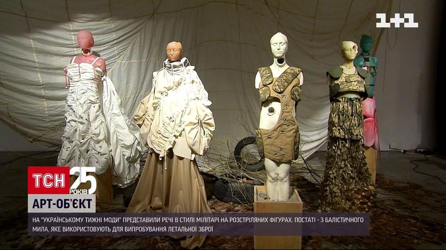 Дизайнери не осторонь. На "Українському тижні моди" представили арт-об’єкт, присвячений війні. Авторка - Поліна Веллер - показала речі в стилі мілітарі на фігурах, які зробила скульпторка Марія Куліковська. Постаті - з балістичного мила, яке використовують для випробування летальної зброї. Ідея продемонструвати "розстріляні" скульптури прийшла авторці після того, як у червні 2014 бойовики захопили арт-центр в Донецьку.