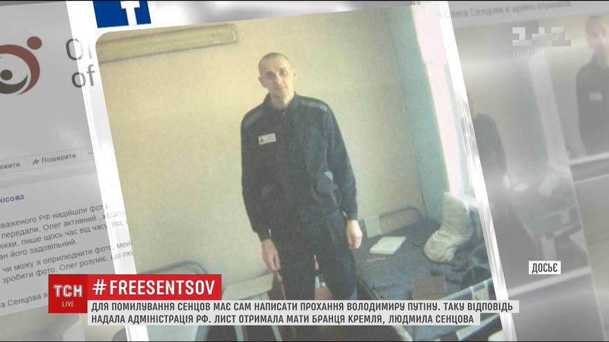 Для свого помилування Олег Сенцов має сам написати прохання Володимиру Путіну. Про це заявили в Адміністрація президента Росії. У листі до матері українського режисера, яка просила про помилування сина, російські чиновники написали - Сенцов до Путіна має звернутися особисто. Свою заяву бранець Кремля може передати через адміністрацію виправної колонії у Лабитнанзі. Тоді і клопотання його родичів враховуватимуться. Також Кремль наголосив, остаточне рішення про долю ув`язненого ухвалює сам президент Росії.