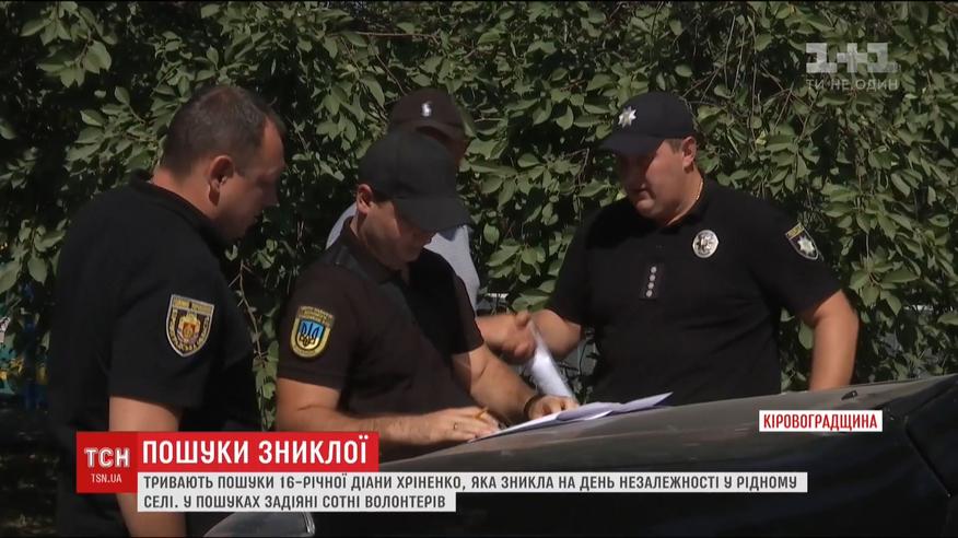 16-річну дівчину, яка зникла на День незалежності, шукають із неба й на землі. Поліція із собаками й сотні волонтерів прочісують населені пункти й лісосмуги довкола рідного села Діани. Минулої п'ятниці вона пішла з дому й не повернулась. Біля хати знайшли закривавлений телефон дівчини. Першим на сполох забив хлопець Діани: під час телефонної розмови з ним дівчина почала кричати і від когось відбиватись.