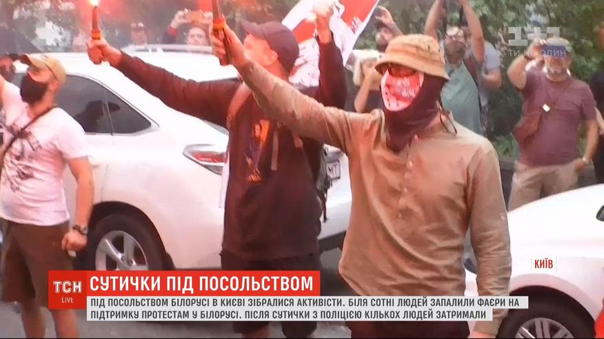 Сутички біля білоруського посольства у Києві. Там надвечір зібралися до сотні білорусів і українців. Вийшли, як заявили, щоби мирно підтримати протести в сусідній країні. Спочатку слухали музику, палили фаєри і кричали гасло "живе Білорусь". Аж раптом поліція скрутила одного з мітингувальників. Він нібито приніс на акцію яйця, якими збирався закидати будівлю амбасади. У натовпі кажуть - це був провокатор. Ще четверо чоловіків, попередньо українські громадяни, спробували прорвати кордон поліції, щоби визволити свого товариша. Їх копи теж затримали. Офіційно арешт людей поліція не коментує, автозаком усіх п'ятьох відвезли у відділок.