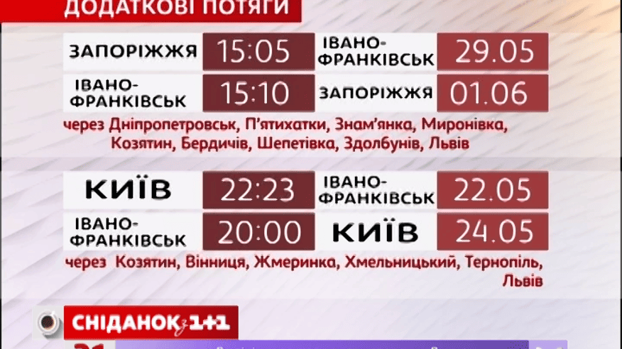 Поїзд Запоріжжя – Івано-Франківськ вирушить із Запоріжжя 29 травня о 15:05, а в зворотному напрямку – 1 червня о 15:10. Додатковий потяг Київ – Івано-Франківськ рушить з Києва 22 травня о 22:23. До столиці повернеться 24 травня о 8 годині вечора.