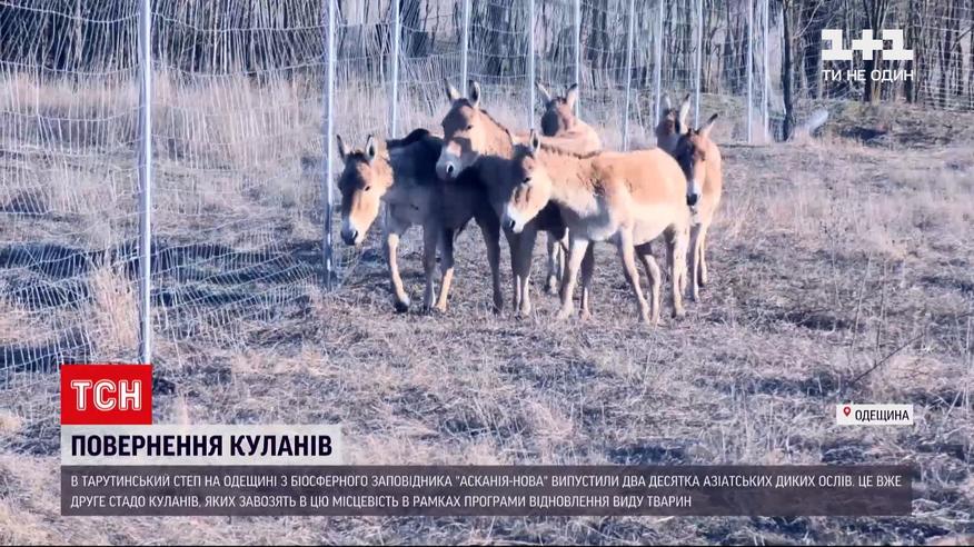 Два десятка азіатських диких ослів - куланів - оселилися в Тарутинському степу в Одеській області. Їх доправили туди з біосферного заповідника "Асканія-Нова" та випустили у спеціальний акліматизаційний вольєр. Це вже друге стадо куланів, яких завозять в цю місцевість природоохоронці в рамках програми відновлення цього виду тварин. У минулому столітті кулани традиційно мешкали в Тарутинському степу, але були повністю знищені мисливцями.