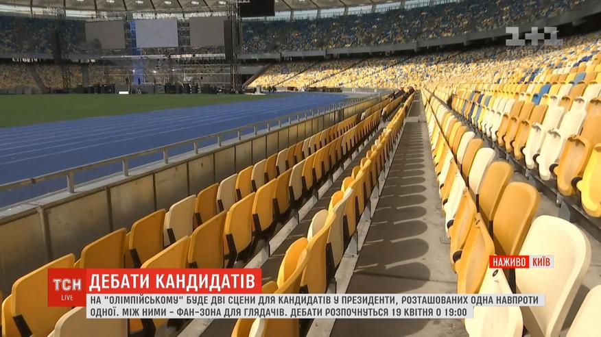 На стадіоні "Олімпійський" другий день триває монтаж сцен для кандидатів у президенти. Сектори будуть заповнені навпіл прихильниками кандидатів. Самі ж дебати на стадіоні транслюватимуть єдино на всі телеканали. Пускати на стадіон почнуть о 16 годині, а самі ж дебати розпочнуться о 19 годині.