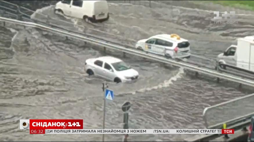 Київське море посеред міста! Дорогу біля станції метро "Лівобережна" затопило! Негода паралізувала рух на вулиці! Об'їхати такі калюжі було неможливо. Машинам доводилося практично плавати по дорозі. А пішоходи просто стрибали у цій величезній калюжі.