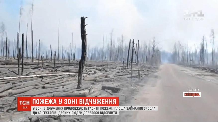 У Чорнобильській зоні відчуження шостий день вирують пожежі. Площа розповсюдження вогню збільшилася до 40 гектарів. Рятувальникам навіть довелося відселити людей. Це декілька родин самопоселенців - здебільшого, пенсіонерів.