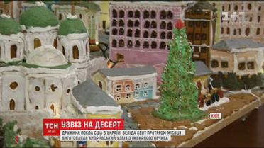 Кулінар і художниця, а заразом дружина заступника американського посла, Веліда Кент спекла цілу вулицю за місяць. Окрім гірлянди та дерев’яної підставки, на якій тримається узвіз, усе тут зроблено з імбирного печива і розмальовано харчовими фарбами. Ялинка, вертеп, люди на вулиці і сорок три будинки на чолі з Андріївською церквою.