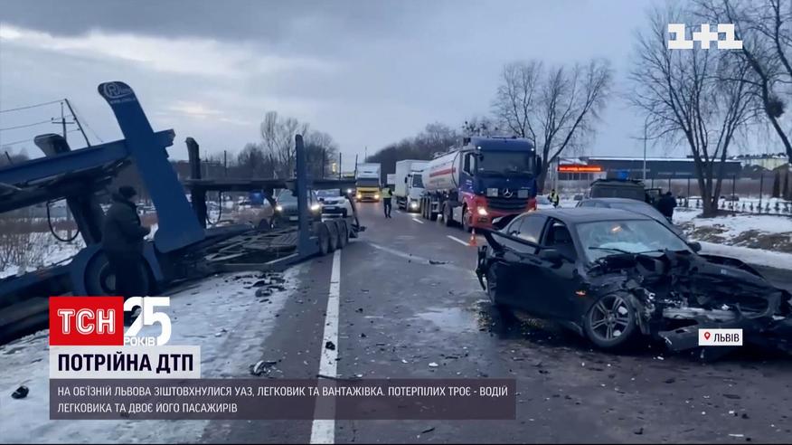 Троє людей постраждали в потрійній ДТП на об'їзній Львова. Момент аварії - зафіксували камери спостереження. На кадрах видно, як "УАЗик" на німецькій реєстрації на швидкості вдаряє попутний легковик. Той від удару вилітає на зустрічну і потрапляє під вантажівку. Після чого ваговоз - злітає у кювет. Усі потерпілі - з легковика.