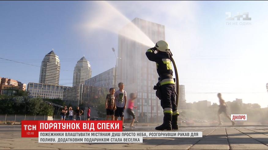 Оригінальний порятунок від спеки. У Дніпрі влаштували душ просто неба. Пожежну машину розмістили на фестивальному причалі, де зазвичай гуляють містяни. Рятувальник у повному екіпіруванні розгорнув рукав і влаштував справжнє водне шоу. Потужність була меншою, ніж використовують для гасіння пожеж, тож приймати такий душ було цілком комфортно.