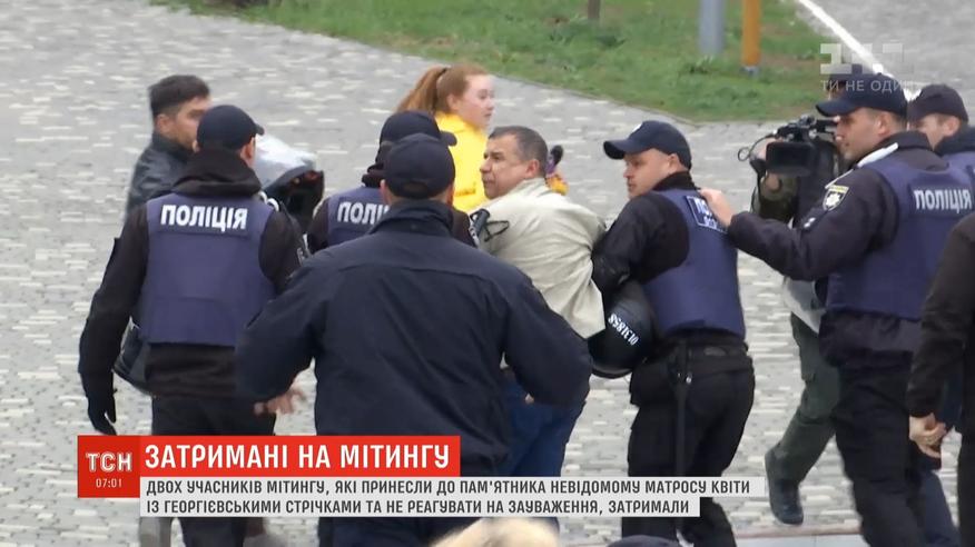 Вони принесли до пам'ятника Невідомому матросу квіти, перев’язані георгіївською стрічкою. На зауваження поліцейського відреагували войовничо, а один із них чинив супротив при затриманні. Обох забрали до відділку та склали адмінпротоколи.