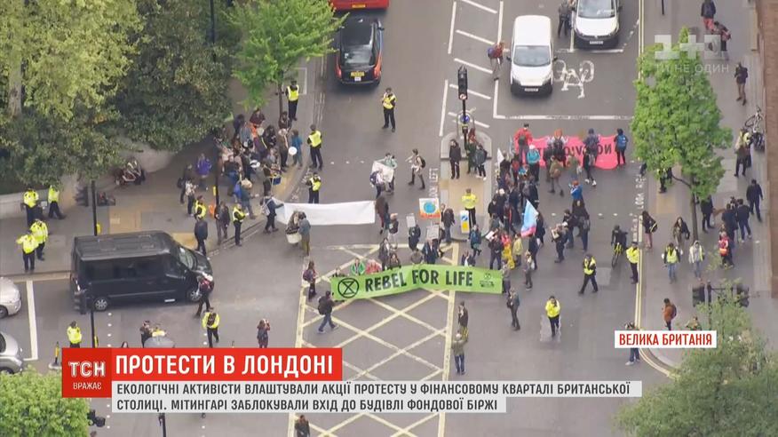 Активісти блокували фондову біржу - семеро людей приклеїли себе до стін будівлі, ще п’ятеро залізли з плакатами на потяг метро. Загалом в акціях в районі Сіті беруть участь близько 400 мітингарів. Так вони хочуть привернути увагу фінансової галузі, яка, на їхню думку, фінансує зміну клімату.