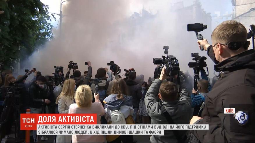 Файєри та димові шашки під будівлею Служби безпеки України. Сотні людей влаштували акцію підтримки активіста, колишнього лідера Одеського осередку "Правого сектору" Сергія Стерненка. На нього тричі вчиняли замахи. Сьогодні активіста викликали до головного управління СБУ.