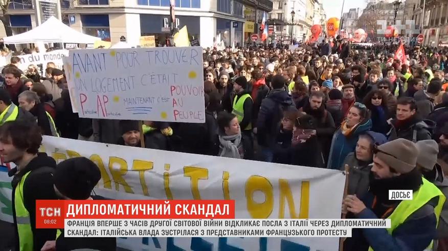 Скандал спалахнув після того, як заступник італійського прем'єра зустрівся з французькими протестувальниками, представниками руху "жовтих жилетів", які вже кілька місяців вимагають соціальних змін і виступають проти президента Макрона.