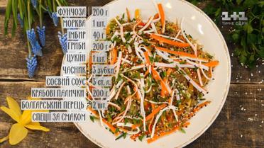 Фунчозу називають їстівним пластиком, а Руслан Сенічкін приготував з нього смачну страву. Для її приготування потрібно: фунчоза – 200 г, морква – 1 шт., імбир – 40 г, гриби – 200 г, цукіні – 1 шт., часник – 3 зубки, соєвий соус – 3 ст. л., крабові палички – 200 г, болгарський перець – 2 шт. Смачного!