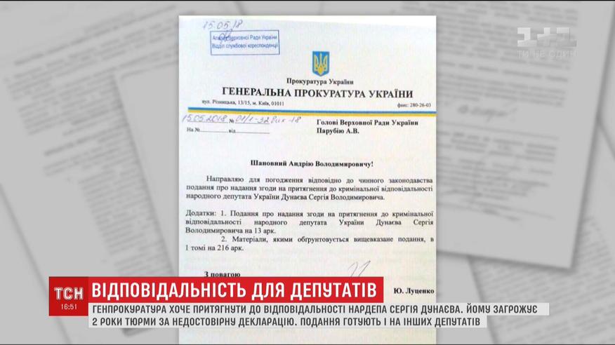 Як стало відомо ТСН із власних джерел, Генпрокуратура готує подання на ще кількох нардепів. Напередодні вона вже попросила Раду позбавити недоторканності депутата "Опозиційного блоку" Сергія Дунаєва. Його підозрюють у приховуванні інформації про свої статки в декларації про доходи. Декларацію Дунаєва наразі перевіряє Нацагентство із запобігання корупції.