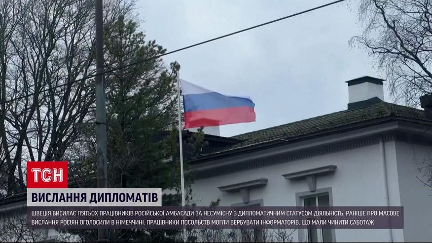 Швеція висилає п'ятьох працівників російської амбасади. Про це повідомили послу країни-агресорки РФ. Як наголосили в Стокгольмі, діяльність цих дипломатів несумісна з їхнім статусом. Лише кілька днів тому про масове вислання росіян заявила Німеччина. За повідомленнями ЗМІ, 30 працівників амбасади могли використати свій дипломатичний імунітет для вербування інформаторів, які мали чинити саботаж і поширювати дезінформацію.