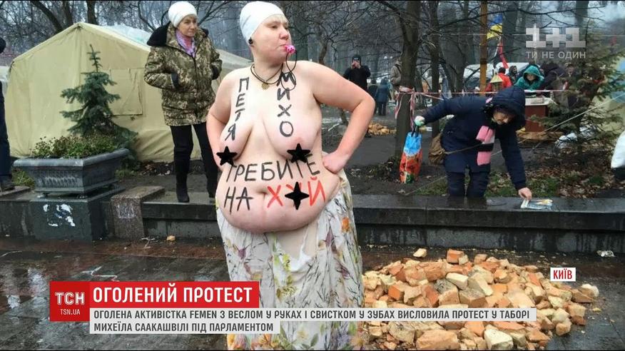 Вранці наметове містечко біля Верховної Ради відвідала гола активістка з веслом у руках, свистком у роті та нецензурними написами на животі. Акція тривала недовго. Модель скрутили поліцейські та прикрили, аби вона геть не замерзла. У Києві сьогодні нуль та мокрий сніг.
