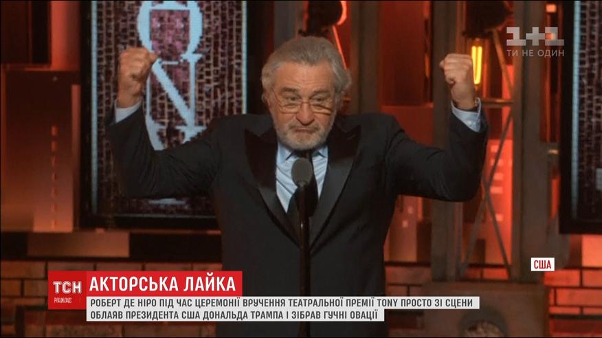 Під час церемонії вручення театральної премії "Тоні" Роберт Де Ніро не втримався від різкої оцінки президента США. Зі сцени Де Ніро мав оголосити наступний музичний виступ, але приплів до своїх слів і Трампа. Нецензурна заява актора викликала гучні оплески, причому більшість у залі аплодували стоячи.