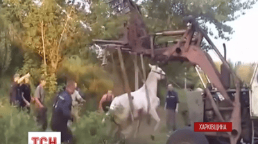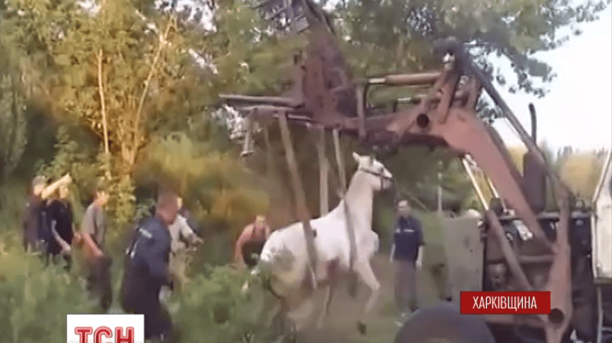 Сталося це поблизу міста Ізюм. Кінь пасся на пагорбі, аж раптом послизнувся і сповз у двометровий відкритий колектор. Щоби врятувати тварину, бригада МНС запозичила трактор у місцевих аграріїв.